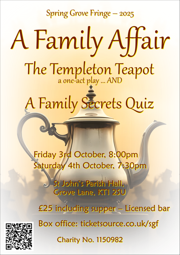 Friday October 3rd at 7:30 pm The Templeton Teapot, by Grace Cooke Strong. A domestic farce, involving the inheritance of a family heirloom, a confusion over who is to be married, and an innocent burglar. Followed, after supper, by a Family Secrets quiz between the tables, with great prizes. Download the poster. Download the programme. See some photos. |