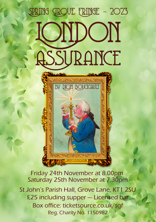 London Assurance, by Dion Boucicault. Friday November 24th at 8:00 pm Saturday November 25th at 7:30 pm Young country girl Grace has agreed to marry ageing London dandy Sir Harcourt in return for his financial support of her family. At a house party at Oak Hall, in Gloucestershire, Harcourt’s son Charles also falls in love with Grace. When his father appears, Charles has to convince him that there is a case of mistaken identity. Then Lady Gay Spanker, a married woman also visiting the Hall, is persuaded by Charles to seduce his father. Much confusion and scheming ensues. Download the poster. Download the programme. See some photos.